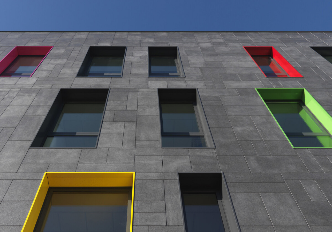 Фасадные панели из керамогранита содержат поверхность из композитного материала, то есть обработанного прессом и обжигом состава из белой глины, полевого шпата и песка. Благодаря этому готовая плитка становится минимально пористой и фактически неуязвимой. Утепление фасада с облицовкой керамогранитом имеет много преимуществ с учетом основных характеристики материала: